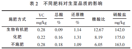 与单施化肥相比, 生物有机肥的施用可显著增加大白菜和西瓜的直径、单株(果)质量;还可改善番茄、辣椒的品质,使番茄和辣椒中维生素C 及还原糖的含量增加。通过研究不同施肥方式对生菜品质的影响, 发现施用阿姆斯生物有机肥可使生菜维生素C 含量增加,总酸降低,糖酸比显著增加,同时可显著降低易诱发癌症的硝酸盐含量(表2),在改善生菜口感、提高产品安全性方面具有重要作用。