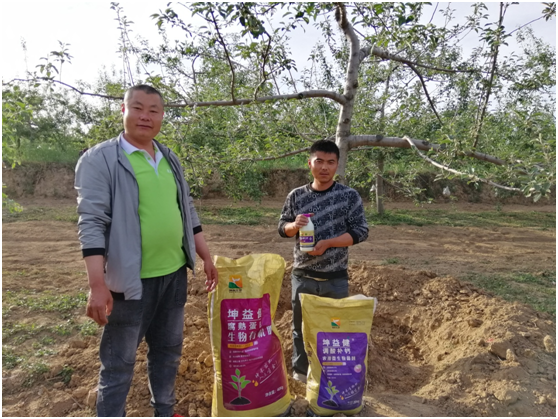 使用方法:从苹果树树冠滴水线开始往树干处开沟,见到根为止,去除腐烂的根系,使用坤益健腐熟蛋白生物有机肥20斤配合坤益健调酸补钙2斤均匀撒施在施肥沟里,和土搅拌均匀,再使用坤益健100菌剂100ml兑水30-50斤,进行浇灌,然后覆土。